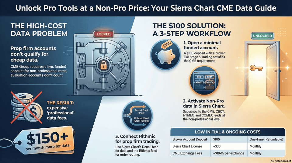To access real-time CME futures data in Sierra Chart at non-professional rates and trade with prop firms like The Futures Desk or Lucid Trading, you need a funded futures account. This guide shows you the easiest way to fulfill this requirement with minimal capital.
